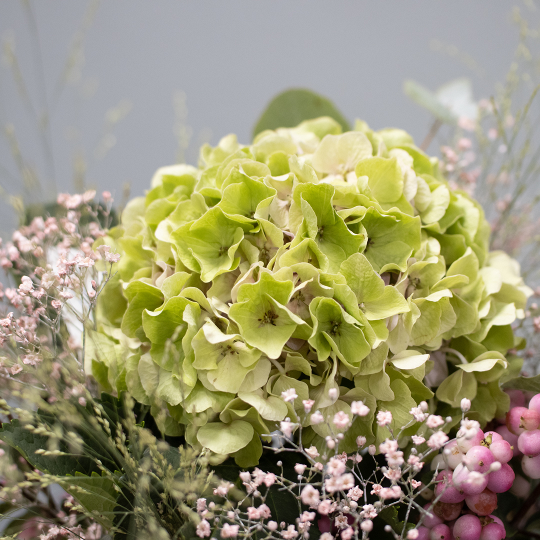 Zart, luftig und doch ausdrucksstark. Unser Strauss „Hortensienliebe“ vereint die Leichtigkeit von Eukalyptus und Gräsern mit der beeindruckenden Blüte der Hortensie und rosafarbenen Beeren. Ein modernes Arrangement, das Natürlichkeit und Stil perfekt verbindet.