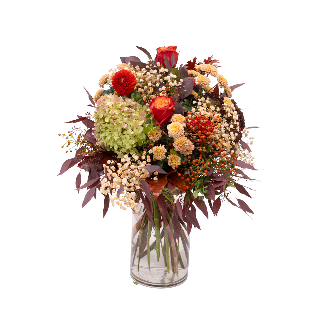 Ein ausdrucksstarker Strauss in kräftigem Rot, warmem Orange, zartem Creme und Naturtönen, inspiriert vom lodernden Farbenspiel der herbstlichen Natur. Mit Rosen, Chrysanthemen, Hortensien, Beeren und herbstlichem Laub bringt dieser Strauss wohltuende Wärme in jedes Zuhause.