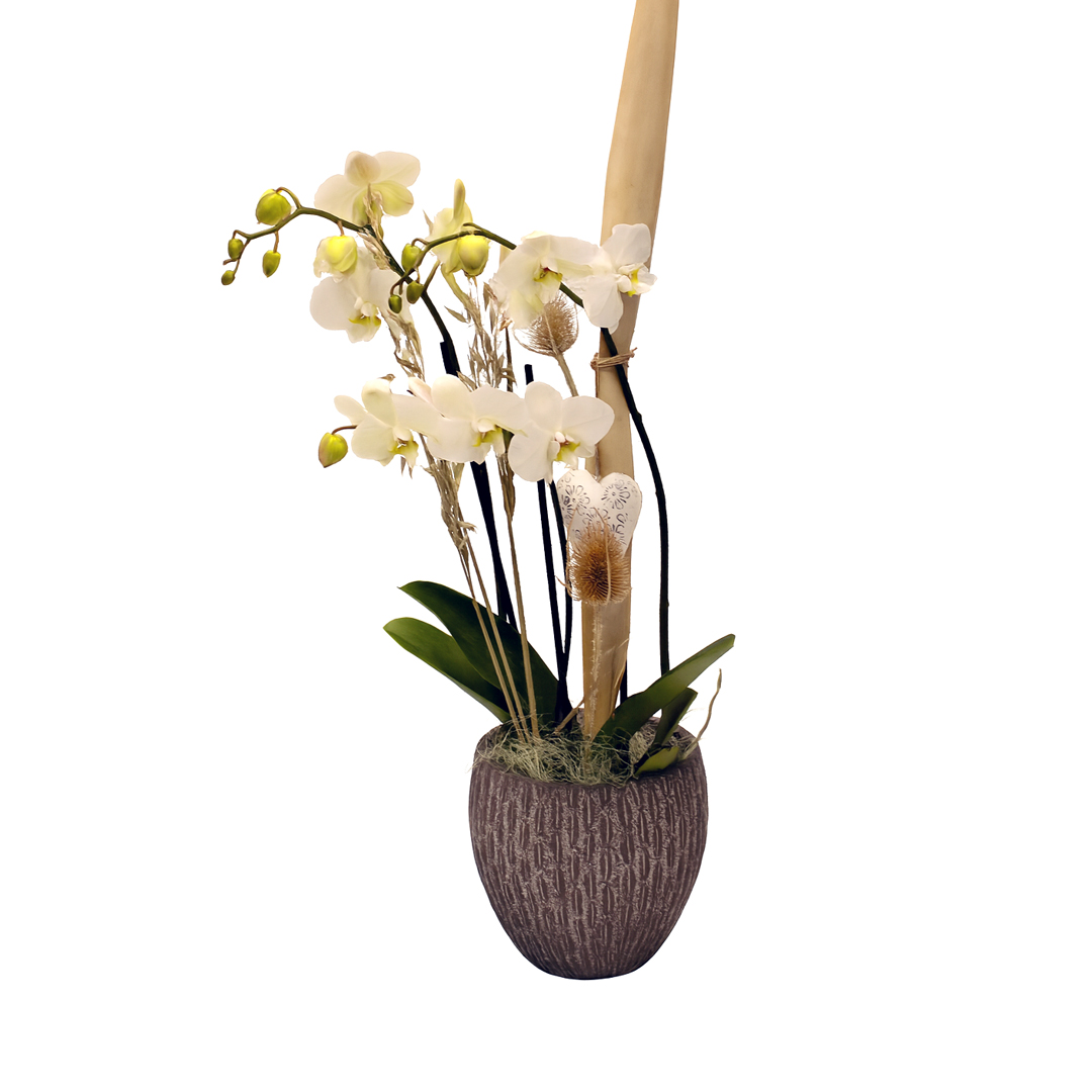 Eleganz trifft Natürlichkeit: Die weisse Orchidee strahlt in ihrer schlichten Schönheit und wird durch herbstliche Akzente stilvoll ergänzt. Ein dekorativer Hingucker für Tisch, Empfang oder Schaufenster. Zeitlos und modern.